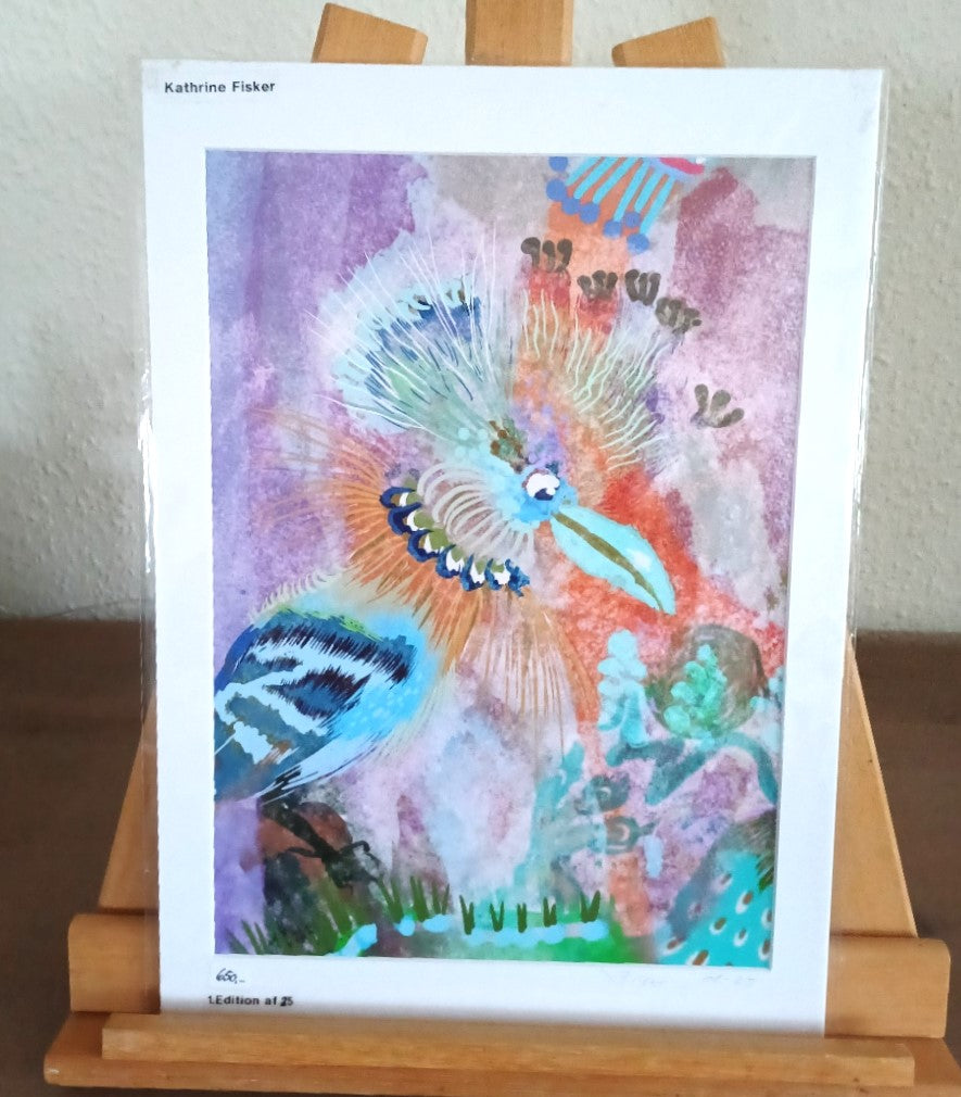 Happy Parrot er et farverigt og livligt digitale maleri af Kathrine Fisker, der emmer af glæde, fantasi og kreativ energi. Værket forener intense turkise, lilla og varme orange nuancer i et legende univers, hvor den dekorative papegøje står som et sprudlende midtpunkt omgivet af drømmende detaljer og organiske former.