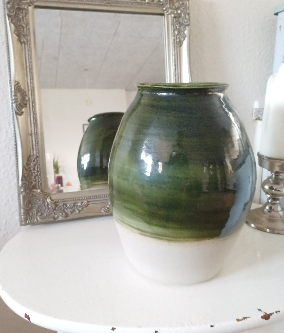 En smuk og stor håndlavet keramikvase fra Kähler, der kombinerer klassisk dansk design med autentisk håndværk. Vasen har en elegant, organisk form og en dyb, levende glasur i mørke nuancer med lys bund, som giver et unikt og eksklusivt udtryk. Hver vase er håndlavet, hvilket betyder, at små variationer gør den helt særlig.